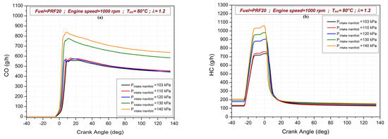 The effects of intake manifold pressure on HC, CO, NOx and soot emissions for the RCCI combustion mode are seen in Figure 7. The nOx and soot emission values increase due to the effect of rising in-cylinder temperature with increasing intake manifold pressure. The minimum value of NOx emission is recorded as 0.110 g/h at a 103 kPa intake manifold pressure. In addition, an increase in HC and CO emissions is also observed as more charge is taken into the cylinder with the increase in intake manifold pressure. The maximum values of these emissions are obtained at 140 kPa intake manifold pressure. In the analyses performed in the closed cycle, it is observed that the HC emissions are at different values before direct injection with increasing intake manifold pressure, since approximately 8% of the residual exhaust gas formation was defined after combustion in the cylinder. As the intake manifold pressure increases, it can be stated that the emissions are released at lower crank angles with increasing temperature.