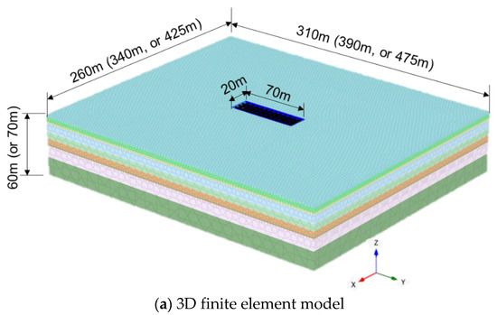 To eliminate any impact of excavation activities on the boundary of the 3D model, the distance of the mesh boundary in the X and Y directions was set from 260 to 425 m and from 310 to 475 m, respectively, for different cases (Figure 2). Regarding the boundary in the Z direction, it was set to 60 m below the ground surface level, while the value was extended to 70 m in Case 6 due to the extremely long wall compared to other cases. The type of mesh was “fine” for all analyses. The sizes of the 3D model and the mesh are shown in Figure 2a. The finite element mesh used in the models included an average of 645,833 10-node tetrahedral elements with an average size of 4 m. The structural elements were modeled with a linearly elastic behavior. The steel strut and diaphragm wall were simulated, respectively, using the note-to-node anchor and plate elements. The properties of these structural elements are shown in Figure 2b. Soil responses were defined based on the Mohr–Coulomb (MC) model for clay and advanced soil models for sand, such as the Hardening Soil (HS) model.