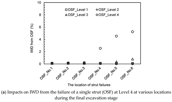 The same approaches were examined at various excavation stages to explore the impacts of OSF. For instance, OSF was initially set up to occur at Level 4 right after completing its final excavation stage (stage 5). As for stage 4 of excavation (excavation to 14 m below the surface level), the strut failure was set up to occur at Level 3 before the installation of Level 4 struts. Similarly, OSF at Level 2 and OSF at Level 1 were set up before installing Level 3 and Level 2 struts for stage 3 and stage 2 excavations, respectively. Figure 4b shows the changes in IWD through the different schemes of strut removal at each stage. In terms of results, the most significant change in IWD is always achieved once an existing lowest strut level is removed. In fact, the difference in terms of percentages of IWD for various excavation stages is in a range from 5 to 7%.