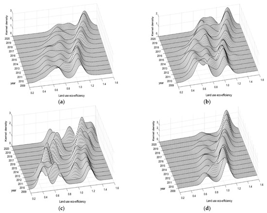 In this section, the kernel density estimation was chosen to profile the dynamic evolution of LUEE in urban agglomerations. A widely adopted non-parametric estimation method with an emphasis on focusing on the actual data, it has been commonly applied to research inhomogeneous distributions of geospatial things [72,73,74,75]. We assume that is the density function reflecting the LUEE in urban agglomerations and is an independent identically distributed sample.