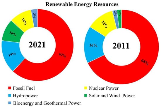Transitioning to an energy system based on renewable sources and energy efficiency, and away from fossil fuels, could be a game changer for creating a more secure, resilient, low-cost, and sustainable energy future. The utilization of renewable energies has become a crucial factor in meeting the increasing electricity demand []. Each nation has its own set of objectives and responsibilities regarding leveraging its potential for renewable energy (RE) sources []. The energy sector has witnessed a remarkable achievement for RE sources. The majority of RE is utilized in the power sector and building sector. However, except for the power sector, the share of RE in all other sectors is increasing slowly. Between 2011 and 2021, the share of RE in global electricity generation increased by 8%, with solar and wind power accounting for over 10% of the total electricity produced for the first time in history. The share of RE in electricity generation increased by 7.9% between 2011 and 2021, as shown in Figure 1. Despite this progress, the current adoption rate of RE is insufficient to achieve the net-zero emissions goal by 2050 [].
