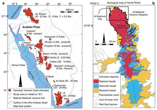 (a) The Arabian Peninsula is home to the Cenozoic volcanic fields (Harrats) characterized by vast lava expanses, and their eruption duration range is presented 10 Ma - present. (b) Geological map of HR with the main volcanic lithostratigraphy units [,].