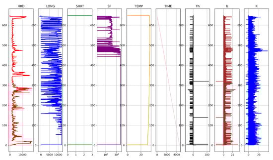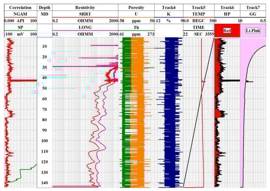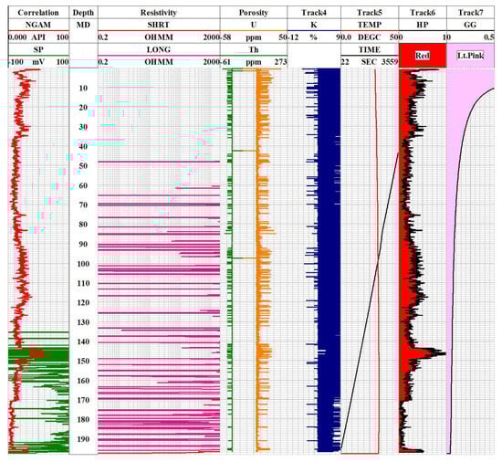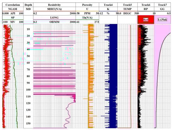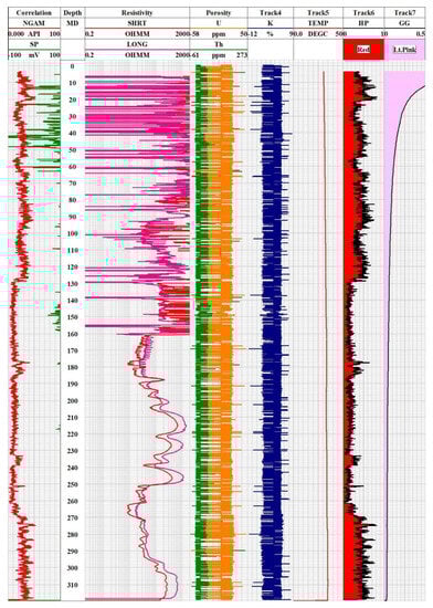 GR spectrometry is frequently used in the lab to assess HP []. Numerous researchers have used various methods to evaluate HP, including the airborne spectrometry GR approach [,] and the GR logging method []. When calculating HP as a function of depth, the natural GR log using API (American Petroleum Institute) units is quite helpful []. So, for calculating the HP parameter, we employed the GR log. We used Equation (1) to determine the HP.