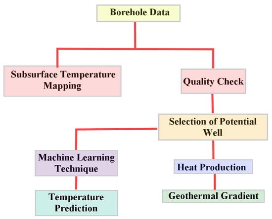First, we perform a data quality check and select four wells based on their temperature value being less than 50 °C and depth being higher than 450 m. RAH-02, RAH-07, RAH-13, and RAH-17 are used for further well logs analysis to perform machine learning for predicting the temperature. The available log curves for the four selected wells are natural gamma ray (NGAM), self-potential (SP), long normal resistivity (LONG), short normal resistivity (SHRT), high resolution density (HRD), formation density (DENS), porosity, borehole temperature (TEMP), time, thorium (Th), uranium (U), and potassium (K). The graphical display of the well log curve of RAH-13 is shown in Figure 4. The detailed methodology of the work performed based on the curves is described step-by-step in Figure 5.