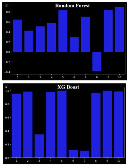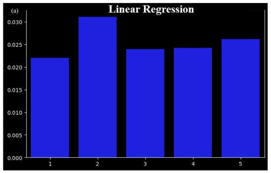 Bar plot for cross-validation score of (a) linear regression, (b) random forest, and (c) XG-Boost model for temperature prediction.