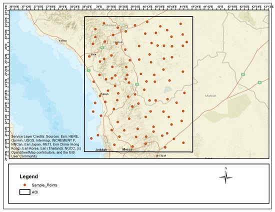 In this study, 100 different sample locations within the study area were selected to obtain LST and NDVI data within the study area. These sample points, representing the collection sites for LST and NDVI measurements, are depicted in Figure 8, with orange indicating the sample points and black squares representing the boundary of the area under study. The NDVI was calculated using the near-infrared and red bands of the Landsat satellite, as described in Equation (3) [].