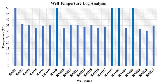 Well logs temperature graphical presentation, which shows the names of the wells plotted on the X-axis and the temperature on the Y-axis.