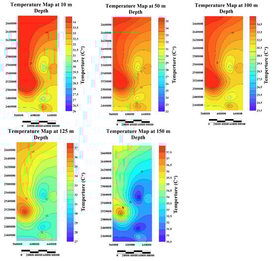 Subsurface temperature mapping was performed to assess the temperature variation with respect to depth. Temperature maps were developed at depths of 10 m, 50 m, 100 m, 125 m, and 150 m, as shown in Figure 10. The range of temperature varies from 0 to 40 °C. It can be observed that the south portion of the map shows geothermal potential because the highest temperature is encountered in that area.