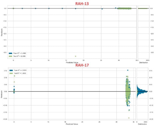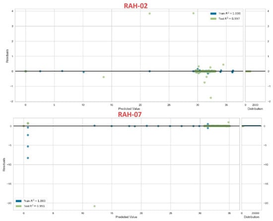 The residuals plot is frequently used to examine the variation in the regression error. A linear regression approach is typically adequate for the data if the points have an even distribution across the horizontal axis; alternatively, a nonlinear model is preferable. Figure 15 and Figure 16 below show the residual cross-plot generated based on XG Boost algorithms. The training data are shown by the green color, and the predicted datasets are shown by the blue color. The RAH-02, 07, 13, and 17 wells show the best results for temperature prediction (Figure 16).