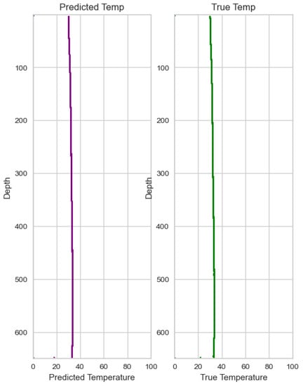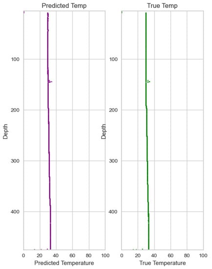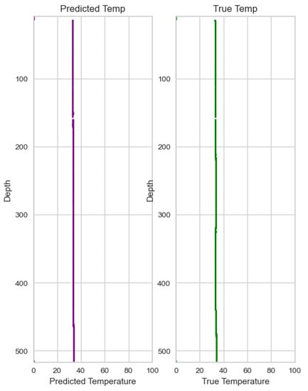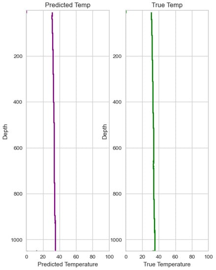 On the basis of all the algorithms, the XG Boost gave the best result for training and testing. So, we used XG Boost for the prediction of the temperature curve. Figure 17, Figure 18, Figure 19 and Figure 20 are the predicted vs. actual temperature for the RAH-02, 07, 13, and 17 wells, respectively. The predicted temperature is shown in purple, and the true temperature is shown in green. The scattered points show the high-temperature values, which are an indication of a geothermal reservoir.