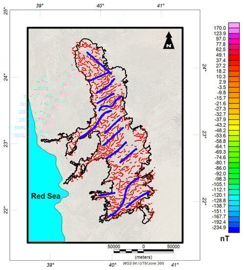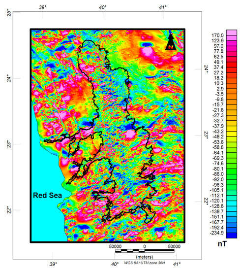 The aeromagnetic data were obtained from the Saudi Geological Survey (SGS). An early interpretation of the magnetic data over the Red Sea was provided by []. The CET Grid Analysis contains tools for texture analysis, phase analysis, and structure detection. These algorithms are useful for grid texture analysis, lineament detection, edge detection, and threshold detection. More details on the CET can be found in [,,,,].