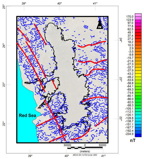 - Hall, S.A. A Total Intensity Magnetic Anomaly Map of the Red Sea and Its Interpretation; US Geological Survey: Reston, VA, USA, 1979; pp. 1–260. [Google Scholar]