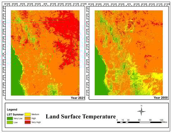 The measurement of LST plays a vital role in identifying potential locations for hot springs sites. Landsat satellite images can estimate the surface temperature for the entire study area []. The LST derived from RS image inversion was utilized for quantitative analysis, enabling the detection of geothermal anomaly zones to mitigate the impact of solar radiation on the land surface []. The collection of LST data offered valuable insights into the distribution and characteristics of geothermal reservoirs and subsurface areas containing hot rocks or fluids suitable for geothermal energy production [,].