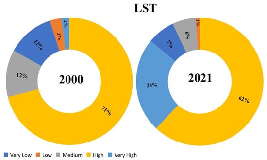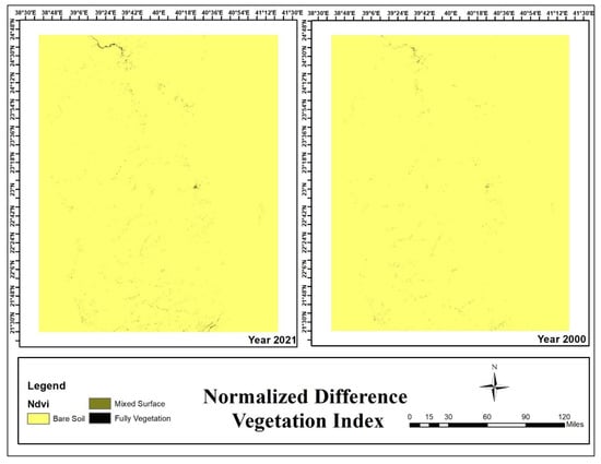 The values of NDVI and LST were then extracted for the observed years, namely, 2000 and 2021. The relationship between LST and NDVI was determined using Pearson’s correlation coefficient approach.