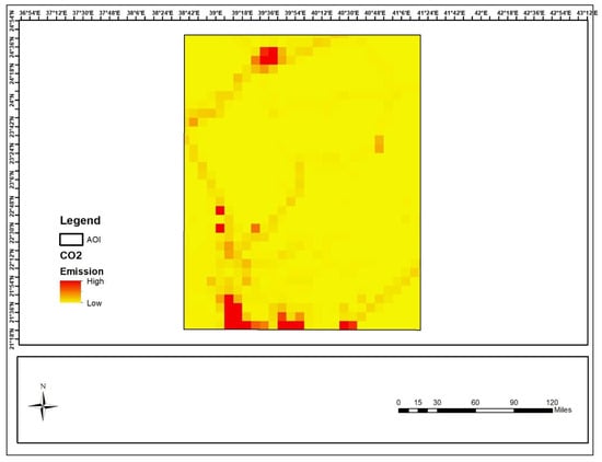 The EDGAR dataset was used to develop the CO2 emission map over the study field. The prime objective of EDGAR is to provide scientists and policymakers with information on the evolution of emission inventories for all countries worldwide over time. It also offers the scientific community grid maps at a resolution of 0.1 × 0.1°, illustrating the sources of emissions []. It has become evident that a strong correlation exists between active tectonic regions and unusual emissions of CO2 from the Earth’s crust. Their high permeability characterizes faults and fractures and serves as preferential pathways for the upward migration and release of deep-seated gases into reservoirs or the atmosphere. Indeed, present-day volcanoes release relatively very small quantities of CO2 compared to land-use changes [,]. An increase in geochemical parameters, specifically the LST as well as CO2 emission within the volcanic active area, were observed [].