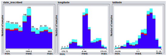 As observed from Table 2, the proposed dataset includes most of the input variables used in the literature review, except for some of the physical and environmental factors. However, both datasets use the same output variables, such as natural, mixed, or cultural types of world heritage sites. The overall input and output parameters in this study are detailed in Figure 1. The output parameters, called “class”, are represented by the colors blue for cultural, red for mixed, and turquoise for natural, as detailed in Figure 2.