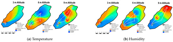 The experimental results of the study on air pollutant parameters were analyzed for different months of the year, with a focus on March. The findings, illustrated in Figure 4a–i, present the measurement data plot for various parameters such as temperature (in C), humidity (in %), CO (in PPM), CO2 (in PPM), NH4 (in PPM), propane (in PPM), VOC (in PPM), wind (in MPH), and smoke (in PPM) at different altitudes. Moreover, Table 1 encompasses the factual information and the variance projected by the interpolation model. The actual data acquired from sensors mounted on drones, which were averaged from diverse elevations, are exhibited in Table 1. These outcomes clearly indicate that the density of air pollutants differs substantially with altitude. The levels of pollutants such as CO, CO2, NH4, propane, VOC, wind, and smoke were observed to be higher at lower altitudes closer to the solid waste, whereas higher altitudes had comparatively lower concentrations. This highlights the impact of solid waste on the environment and the need for proper waste management practices.
