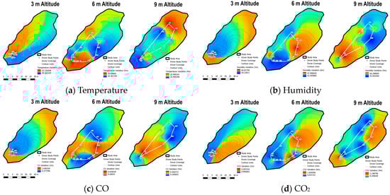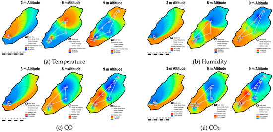 The heat index, a measure of the human-perceived temperature, reached its highest level of 56.9 °C at a height of 3 m (Figure 8i). The increase in the heat index can be attributed to the presence of pollutants like ethanol, acetone, and toluene, which are often found in industrial areas. However, the overall air quality seemed to improve with increasing height as the concentration of CO and NH4 decreased at higher altitudes. Overall, the data suggest that air pollution levels decrease with altitude, with the lowest levels observed at 9 m. Nonetheless, the distinct patterns for individual pollutants differ, as illustrated in Figure 9, suggesting that various factors could impact their dispersion in the atmosphere. Notably, the information demonstrated in Table 4 was amassed through sensors mounted on drones, which encompassed a limited radius at 3 m above ground level and progressively broadened as the altitude heightened. The data collected from these sensors can help develop effective measures to control air pollution in urban areas. These results could be helpful for policymakers and environmental researchers to develop strategies to mitigate air pollution.