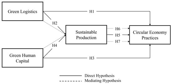 In addition, when confronted with external environmental challenges, industries utilize HR practices as a crucial tool for developing human capital to address environmental problems []. Furthermore, organizational participation and training can expand the human capital pool. Consequently, enterprises can appoint individuals with environmental consciousness to meet environmental requirements, thereby altering workers’ capability to accomplish environmental objectives []. Nonetheless, human capital alone is insufficient for the shift to a CE business model. Multiple studies have demonstrated that GHC promotes sustainable production in businesses. Zaid et al. [] contend that GHC is a catalyst for firms’ green supply chain practices, such as green or sustainable production. Another body of research shows that sustainable production is critical for enterprises implementing CEP []. Jinru et al. [] report that SP is a crucial mediator via which firms’ green practices like GLM and GHC affect CE implementation. Thus, we hypothesize that: