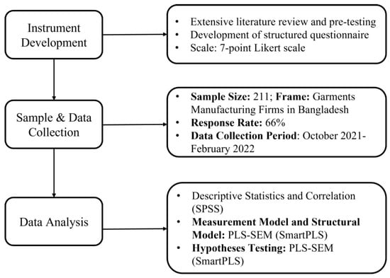 We surveyed Bangladeshi readymade garments (RMG) manufacturers to evaluate our hypothesis. These manufacturing companies were chosen since they operate in a competitive and dynamic environment in which competitive strategy techniques, such as GLM, GHC, SP, and CEP, are required for growth and success. In addition, we chose Bangladesh as an empirical study setting for several factors [,,,,,]. Bangladesh’s RMG industry contributes to around 83% of the country’s entire export volume. Bangladesh’s garment sector has expanded steadily over the past several decades, surpassing China as the second largest in the world. In order to survive the dynamic business climate at home and abroad, it is essential to explore how Bangladeshi RMG manufacturers may embrace sustainable and environmentally friendly business practices.