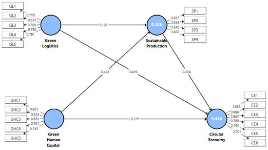 Additional statistical analysis was carried out to determine whether a common method bias (CMB) would have impacted the study. According to Podsakoff et al.’s [] recommendations, Harman’s single-factor testing was conducted. The results showed that an exploratory factor analysis including all variables yielded a single factor explaining 39.75 percent of the variation, below the 50% criteria. Therefore, in our investigation, no common method bias was found. Additionally, we employed the full collinearity test to investigate CMB. Kock [] proposed the full collinearity test in PLS-SEM to determine the CMB. Variance influence factors (VIFs) are constructed and assessed for all latent constructs using this method. Our constructs’ VIFs were as follows: GHC = 1.284, GLM = 1.129, SP = 1.385, and CEP = 1.561. Since all VIFs are less than 3.3, our model is devoid of common method bias []. Figure 2 provides a graphic representation of the complete methodology.