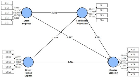Following the evaluation of the model’s multicollinearity and predictive power, we evaluated the direct and indirect interactions between the GL, GHC, SP, and CEP. Table 6 depicts each hypothesis’s path coefficients, standard errors, and t-values.