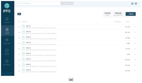 First, the vehicle detection model was well-distributed and stored based on the blockchain and the IPFS. The dispersion of model information increases the difficulty of obtaining the complete model information and prepares for tamper-proof checking, permission management, and inference in terms of data structure. The model owner initially divided the model into sub-networks. There are various ways to achieve this model division, and one of these ways is depicted in Figure 2. The model was divided into nine sub-networks. Subsequently, based on this division, the model owner uploaded these sub-network files to the IPFS, as illustrated in Figure 4a. In Figure 4a, SN1.h5, SN2.h5,…, SN9.h5 represent the files corresponding to the sub-networks, and beneath each file name is its CID. The interconnections among the nine sub-networks are defined using two lists: