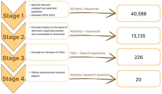 As a result, this study systematically chose twenty relevant articles, which were then meticulously reviewed based on a four-stage search method outlined in Figure 1.