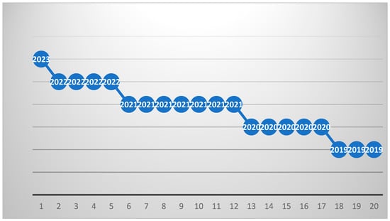 On the basis of the graph (Figure 2), it is evident that the majority of the selected articles on measuring the level of sustainability were written in recent years, which is not surprising since this was one of the selection criteria. The number of articles has gradually increased since 2019, with three articles published that year. The following year, the number increased to five and seven articles were written in 2021, indicating a significant increase in research interest in the topic. In 2022, four articles were published, which is relatively consistent with the previous year. Interestingly, an article has already been published in 2023, which may indicate a continuing trend in research on measuring the level of sustainability in companies and economic sectors.