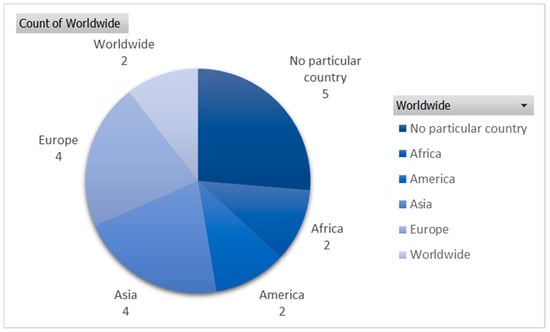 To facilitate analysis, we categorise the articles according to the geographical location of the countries selected for the investigation. This enabled us to observe the distribution across different regions and to gain insight into which regions were studied more extensively. According to the diagram (Figure 3), it can be concluded that Europe and Asia received the most attention in the selected articles, excluding those that did not focus on a specific country.