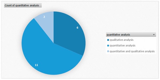 Based on the graph (Figure 6), it can be seen that the majority of the selected articles used quantitative analysis. All the analysed methods were grouped into ‘qualitative’ and ‘quantitative’ methods. Six articles used qualitative analysis, while two articles used both quantitative and qualitative analysis. And the qualitative methods usually consisted of case studies, systematic reviews of the literature, and descriptive statistics.