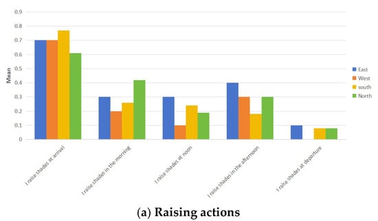 It can be seen from Figure 8 that the time for occupants to raise and lower shades is significantly different. Most shade raise occurs upon arrival and in the morning and most shade-lowering actions appear at noon and in the afternoon. This trend is similar among different orientations (see Figure 9). Therefore, there is a significant difference in the time of shade raise and lowering actions and the modeling of shade actions needs to consider this difference.