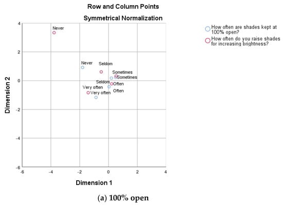 CA was also conducted to determine if there is a relationship between how often occupants keep shades at 100% open and the frequency of raising shades for increasing brightness (see Figure 18). The Chi-square test is 27.669, with a p value of 0.034, indicating that there is a relationship between the two variables. It can be seen that there is a similar trend for the two variables. For example, those who always raise shades for better brightness are more likely to leave shades 100% open. Similar analysis was conducted for the two variables “how often do you raise shades for increasing brightness” and “how often are shades kept at 0% open”. The Chi-square test is 35.657, with a p value of 0.003, indicating a significant correlation. The almost opposite trend was observed with “very often” for increasing brightness close to “never” keeping shades at 0% open. This means that those who raise shades frequently for increasing brightness more frequently leave shades fully open and less frequently fully closed.