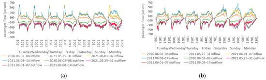 In summary, the passenger flow characteristics of the different stations varied and presented different waveforms. On different days of the same data period, the passenger flow characteristics at the same station were different. For example, there were significant differences in the values and characteristics between the Friday passenger flow and Thursday (the previous day) passenger flow at Lindun Station. The evening outflow peak on Friday was more pronounced than that on the other days. At the same time, in similar but different time periods, the same station had a high degree of similarity in passenger flow. For example, the study date of 1 June 2021 and the reference dates of 25 May 2021 and 8 June 2021 were both Tuesdays, which were the same time in similar but different time periods. The stations in Figure 4 have similar passenger flow values and high similarity in waveform characteristics during these days.