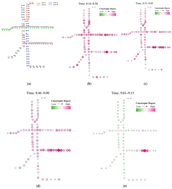The mutational passenger flow of the SZRT network during the interruption event was continuously evaluated, and the dynamic change in the mutation degree during the research period from 8:16 to 9:30 was obtained, as shown in Figure 6. Figure 6a shows a schematic diagram of the Suzhou rail network, with different colors representing different lines. Figure 6b–f show the evaluation results of the mutation degree every 15 min from 8:16 to 9:30. The redder the color and the larger the size of the node, the higher the mutation degree of the passenger flow at the corresponding station. The greener the color and the smaller the size of the node, the lower the mutation degree of the passenger flow at the corresponding station. Figure 6f shows the evaluation results of the normal passenger flow during 9:31–9:45. During 8:16–8:30, when SZRT Line 2 was interrupted, the mutation degree of passenger flow of the whole network was higher than that in other periods. With the passage of time, the mutation degree of the passenger flow of the entire network decreased, especially after Line 2 resumed operation, and the mutation degree of the passenger flow of the entire network decreased significantly. During 8:16–8:30, the mutation degrees of the stations of Line 1 and Line 2 were relatively high. The station with the highest mutation degree was the Yueliangwan station on Line 2, which is an employment-dominant station. The outflow peak at Yueliangwan station during the morning rush hour was significant, so in the case of interference events during the morning rush hour, the mutation degree of the outflow was extremely high. As time went by, the stations with high mutation degrees during 8:31–8:45 were concentrated on Line 2, and the mutation degree of stations on Line 1 gradually decreased. We speculate that lines other than Line 2 had alleviated the impact of interruption events of Line 2 through transfers and other means. During 8:46–9:00, Line 2 resumed operation, and the mutation degree of the stations on Line 2 began to decrease. During 9:01–9:15, the mutation degree of the stations on Line 2 continued to decrease. During 9:16–9:30, other lines were affected by the recovery of Line 2 and experienced a brief rebound in the mutation degree, especially for stations with high outbound demand during the morning rush hour, such as employment-dominant and commercial-dominant stations. During 9:31–9:45, there were no stations with high mutation degrees in the network, which means that the network is no longer affected by operational interruptions and passenger flow returned to normal.