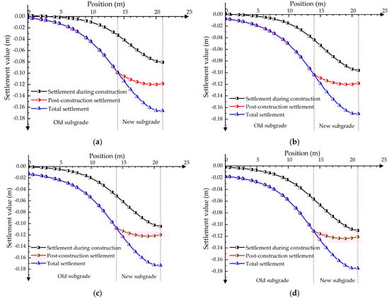 It is generally accepted that the post-construction settlement is the total settlement minus the settlement during construction. In this paper, the total settlement of the old subgrade is the post-construction settlement, and the post-construction settlement of the new subgrade is the total settlement minus the settlement during construction. Generally, the maximum value of the settlement curve occurs near the shoulder of the new subgrade, and the minimum value occurs at the center of the old subgrade. The differential settlement value is the difference between the maximum value and the minimum value of the settlement curve. For the 4 m subgrade, calculation results of the differential settlement in each working condition are shown in Table 4. The post-construction differential settlement is reduced by about 30% relative to the total differential settlement, which is because part of the differential settlement of the new subgrade has been eliminated during the construction, and this is why it is more in line with the actual engineering situation. It also shows that the post-construction settlement analysis method adopted in this study can accurately calculate the post-construction differential settlement of the widening subgrade, which lays a good foundation for the later evaluation of the subgrade settlement.