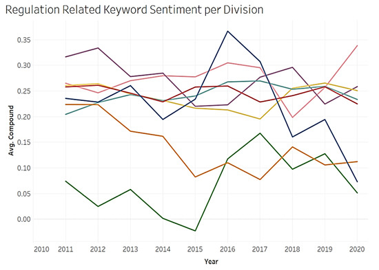 Figure 11 is a line chart showing the compound sentiment score for the aspects of regulatory-related company disclosures. As shown in the chart, the increasing trend in the wholesale trade industry implies companies in this sector have complied with laws and regulation more effectively during the recent year. The compound sentiment in the mining sector decreased from 2019 to 2020.