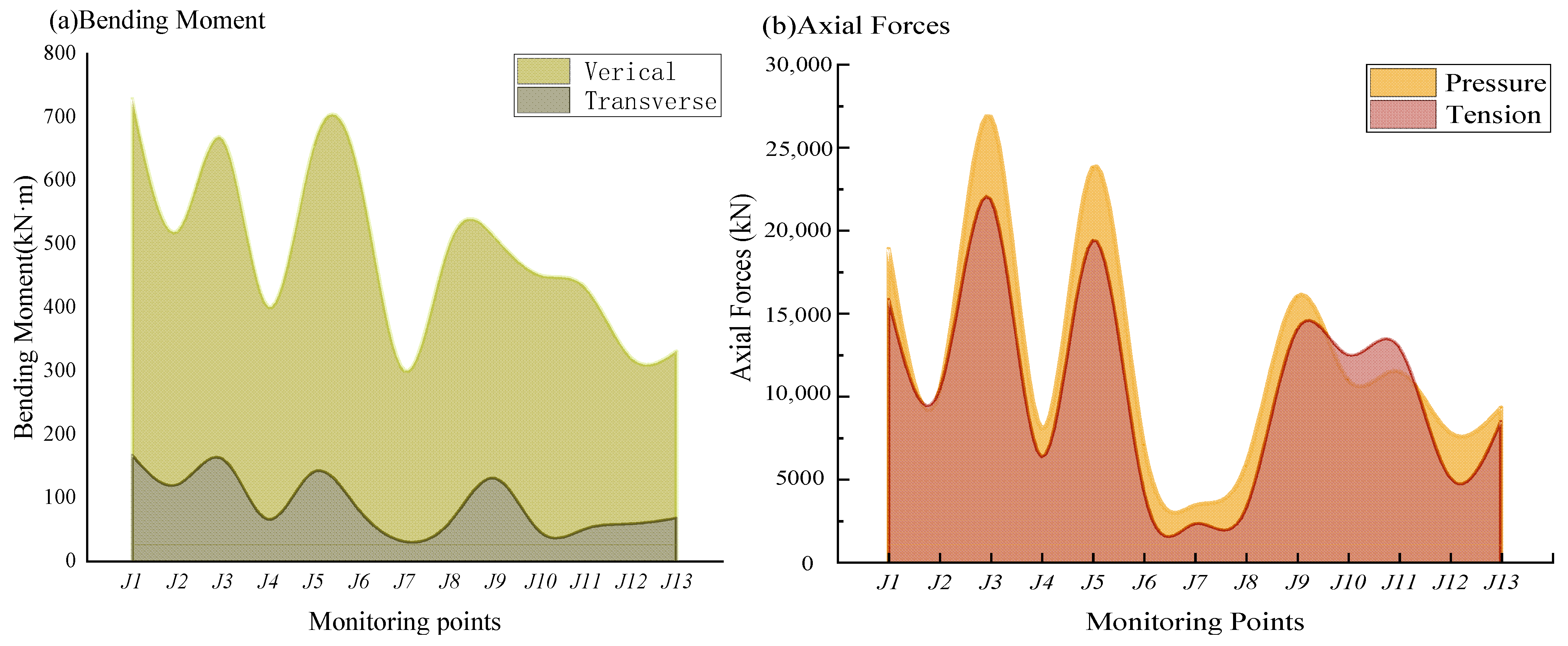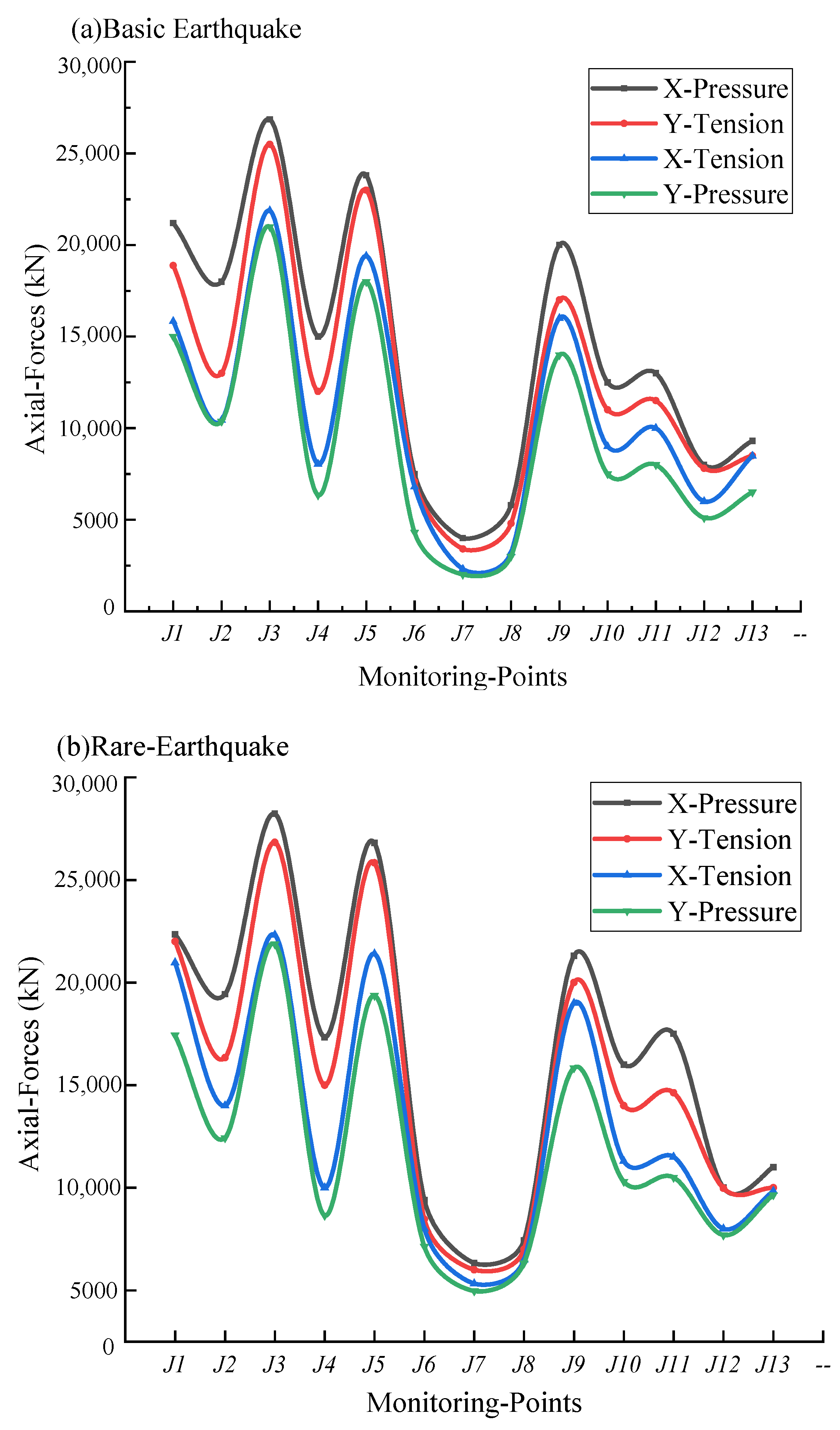 4.3. Analysis of Longitudinal Internal Forces in the Longitudinal Equivalent Stiffness Model Structures