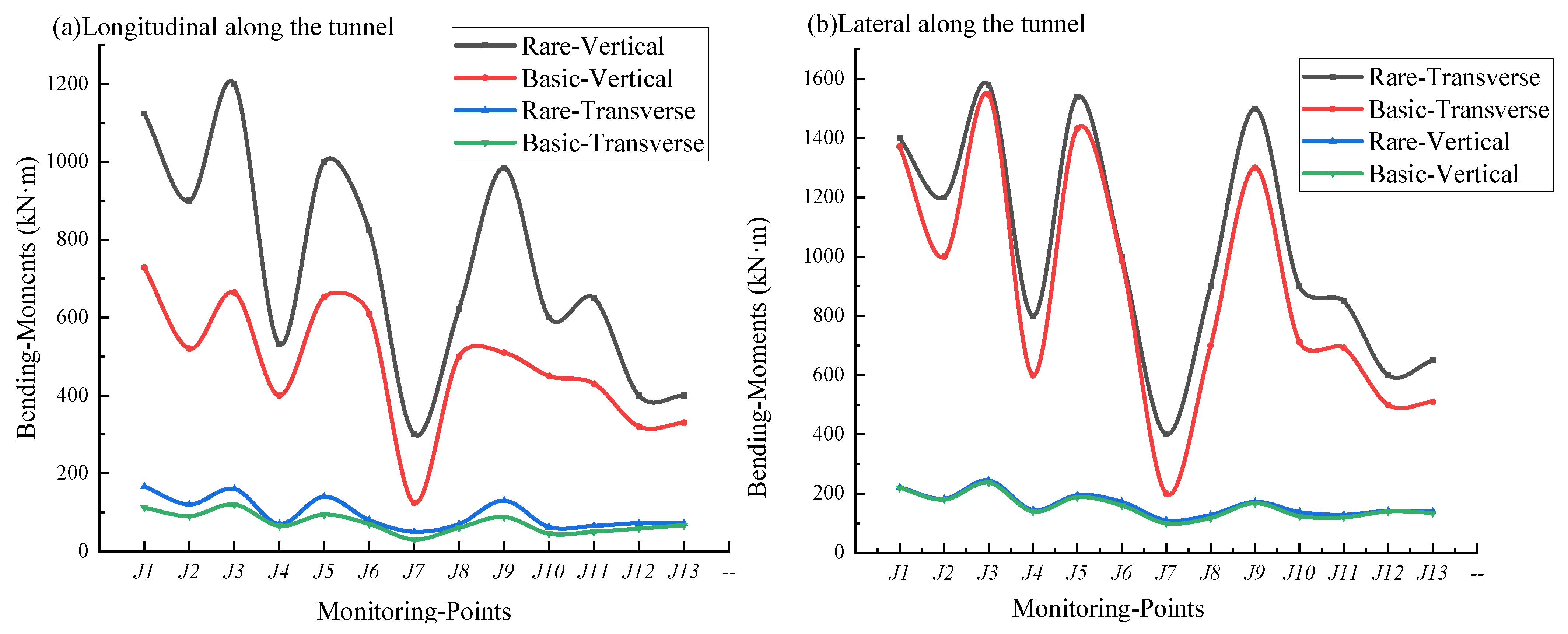 - When seismic waves are excited longitudinally, the longitudinal axial force of the structure is larger. The maximum bending moment is mainly in the vertical plane, while the horizontal bending moment is smaller. The tunnel axial forces are smaller when the seismic waves are excited transversely. The maximum bending moment is dominated by bending in the horizontal plane, i.e., the transverse moment, while the bending in the vertical plane, i.e., the vertical moment, is smaller.
