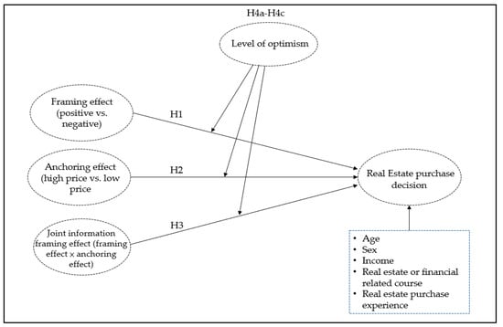 The aforementioned studies have revealed that when facing various situations and in different types of decision-making, individuals may react differently due to their personality traits. Therefore, the magnitude of the effect of various information framings—namely the framing effect, the anchoring effect, and joint information framing—may vary. This study employed the level of optimism as a major moderator and analyzed the respective magnitude of the effect of each of the aforementioned types of information framing on real estate purchase decisions depending on a person’s level of optimism. The following research hypotheses were formulated accordingly: