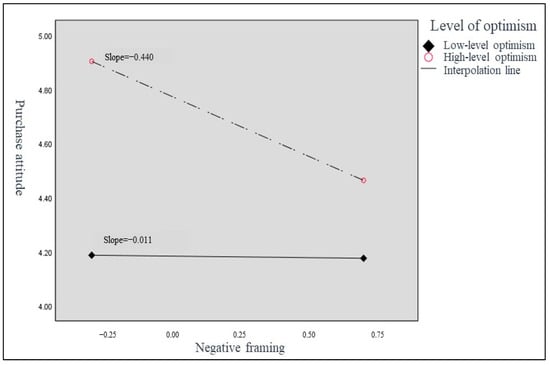 In Model 1, income was positively correlated with real estate purchase decision (β = 0.139, p < 0.01; β = 0.148, p < 0.01; and β = 0.153, p < 0.01), and men were willing to pay more than women (β = 0.108, p < 0.05). Model 2 showed that optimism positively correlated with purchase intention (β = 0.296, p < 0.001) and purchase attitude (β = 0.263, p < 0.001), while negative framing negatively correlated with purchase attitude (β = −0.096, p < 0.05). In Model 3, negative framing × optimism negatively correlated with purchase intention and attitude (β = −0.118, p < 0.05; β = −0.096, p < 0.05), with highly optimistic participants showing stronger effects of negative framing (presented in Table 8). The interaction analysis [] results in Figure 2 and Figure 3 show that the highly optimistic group had significantly negative correlations between purchase attitude and intention with negative framing (β = −0.328, p = 0.051; β = −0.440, p = 0.004, respectively).