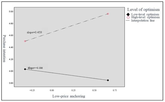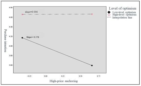 In the anchoring effect analysis, Model 1 examined the impact of high-price anchoring, low-price anchoring, and level of optimism on real estate purchase decisions. High-price anchoring had a significant negative effect on purchase intention (β = −0.108, p < 0.05), while the level of optimism was significantly positively correlated with purchase intention and purchase attitude. Low-price anchoring had a negative effect on willingness to pay (β = −0.212, p < 0.001). Model 2 revealed that the interaction variables had a significant positive effect on purchase intention for highly optimistic participants, with high-price anchoring × level of optimism having a 5% significant effect (β = 0.116, p < 0.05) and low-price anchoring × level of optimism having a 1% significant effect (β = 0.130, p < 0.01). The interaction analysis showed that the negative effect of high-price anchoring on purchase intention was stronger for participants with low levels of optimism (β = −0.578, p < 0.001), while the positive effect of low-price anchoring on purchase intention was stronger for participants with high levels of optimism (β = 0.459, p < 0.01) (Figure 4 and Figure 5) (Table 9).