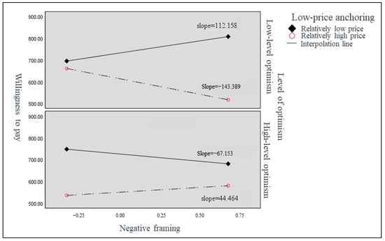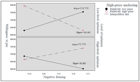 In Model 2, this study examined if the participants’ level of optimism influenced their reactions to joint information framing. Positive framing, negative framing with high-price anchoring, and negative framing with low-price anchoring were all found to have a significant positive effect on willingness to pay (Table 10). An interaction analysis revealed that negative framing was positively correlated with willingness to pay for a relatively low price in high-price anchoring (β = 124.729, p < 0.05) and negatively correlated with willingness to pay for a relatively high price in high-price anchoring (β = −165.001, p < 0.1) for the low-optimism group (Figure 6). Similarly, negative framing was positively correlated with willingness to pay for a relatively low price in low-price anchoring (β = 112.158, p < 0.1) but not for a relatively high price (β = −143.389, n.s.) for the low-optimism group (Figure 7). Conversely, negative framing was negatively correlated with willingness to pay with relatively high-price anchoring information, and the negative effect of negative framing on willingness to pay increased.