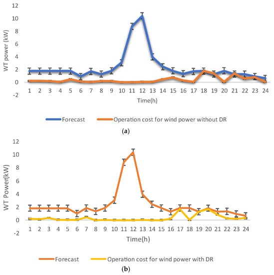 Figure 15 shows how much energy a WT and solar cell produce when operational costs and DR are considered. Figure 16 shows that using DRPs limits the amount of WT and solar cells that can be made while also shifting demand from peak to off-peak times. When consumers take part in the DRP and say they will use less power at a specific time, the system operator can lower the power of the generating units.