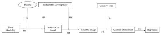 In relation to this study, it is expected that travellers would like to visit a place that considers the environment []. In addition, place likeability includes customers’ judgement of a place []. Finally, the image of a certain country is associated with different aspects such as culture, politics, and economy [], which indicates that sustainable development also plays an important role in country image. Therefore, the following hypotheses are proposed: