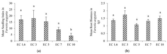 Final Nutrient Content (N—Nitrogen, P—Phosphorous, K—Potassium, Ca—Calcium, Mg—Magnesium, Na—Sodium, Cl—Chloride, and S—Sulphur, in (a) Root and (b) Shoot of Farsetia aegyptia. (Control: EC 1.6). The means followed by the same letter are not statistically different at p 0.001.