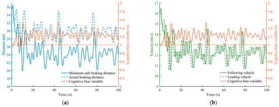 Performance diagram under different acceptable safety levels of the target vehicle. (a) Distance and cognitive bias variable change. (b) Velocity change of two adjacent vehicles.