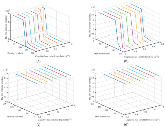 Figure 13 shows that with the gradual development of ICT, safety is also steadily improved. In Figure 13a,b, with the decrease of the threshold, the earlier the first collision occurs, and the smaller the threshold at the same density, the earlier the first collision occurs. When , with road density not exceeding 40 , the vehicle will not collide completely. When , the first collision time is delayed, but the simulation also had collisions in this case. When , the vehicle would not collide under any conditions, which aligns with Figure 12 where the traffic capacity reaches the maximum. At this time, the impact of delay is ignored, and the whole process of vehicles’ starting, stopping, and following is fully controlled by the ICT.