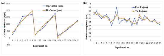 Upon graphically plotting the difference between the experimental and predicted values (obtained through regression analysis) using Equations (1)–(3), it was observed that the difference between the actual and predicted values was less than 20% data error, indicating the reliability of the empirical models. This is depicted in Figure 5a–c, which show the percentage error between the experimental and predicted values for carbon emission, surface roughness, and microhardness, respectively.