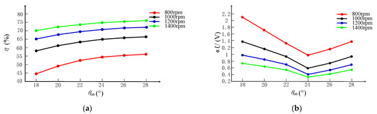 In Figure 6, optimized turn-off angles under different rotor speeds are shown as green spots in the figure. The red dashed line in the figure shows the curve fitting results according to (12), by which the turn-off angle can be regulated according to real-time rotor speed n on-line.